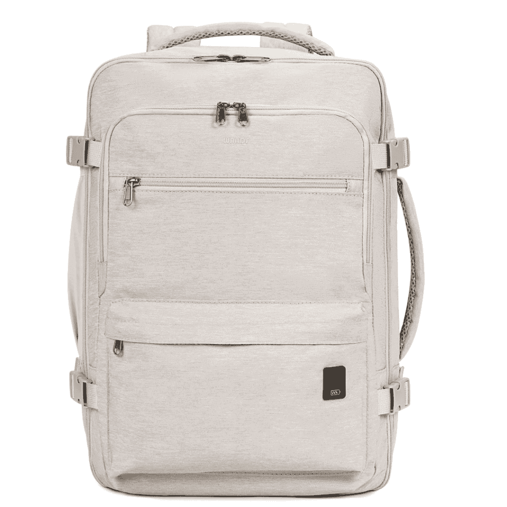 If you’ll be traveling with a laptop, you’ll love this backpack that opens 180 degrees like a suitcase. It’s a padded, water-resistant backpack with awesome features, including room for a 17″ laptop, a USB charging port (charging block required), a wet pocket, a hidden anti-theft pocket, a mesh water bottle holder, plus a large inner compartment to give you optimal space.