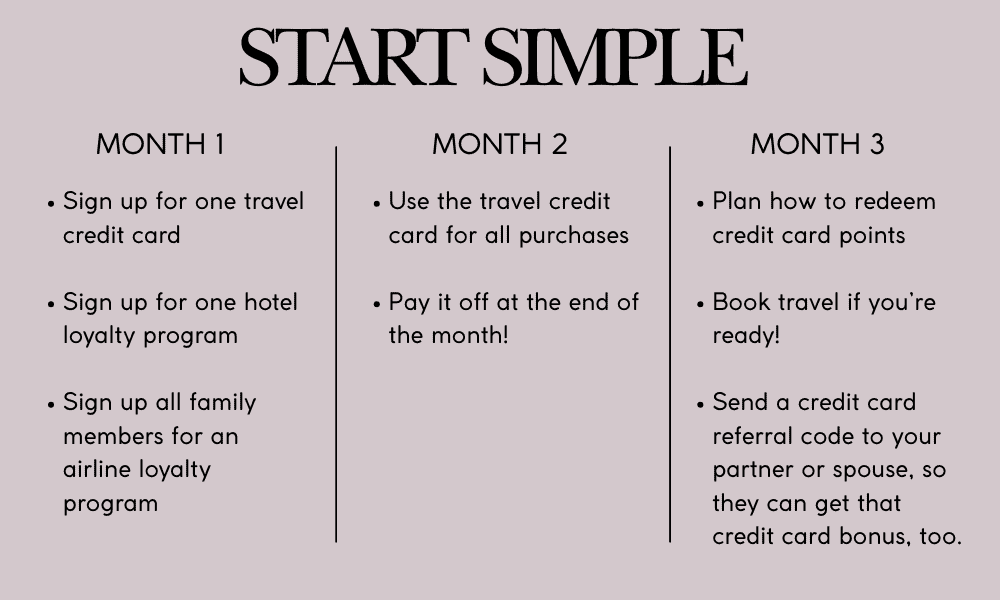 Month One: Sign up for one travel rewards credit card with a good sign-up bonus. Make sure you can comfortably meet the minimum spending requirement. Enroll your entire family in your chosen airline loyalty program and sign one of the grownups up for a hotel loyalty program (or both if they offer family points poolings).