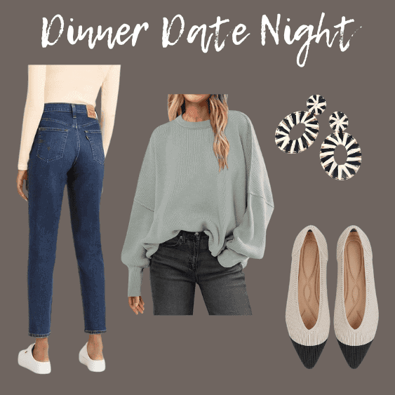 Elevate your indigo-wash jeans with an oversized sweater, statement earrings, and flats for a romantic evening.
