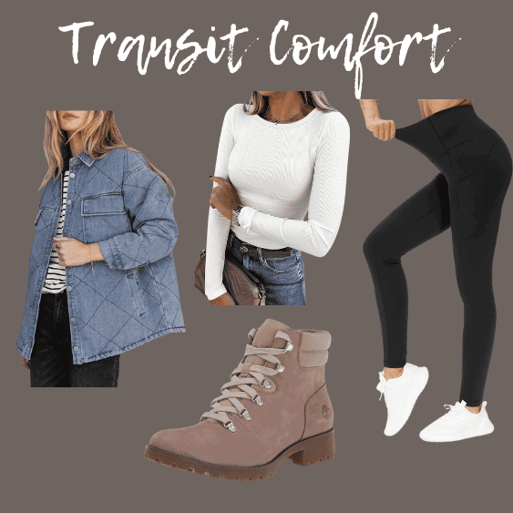 Opt for leggings, a soft long-sleeve tee, a jean jacket, and boots for those long travel days.