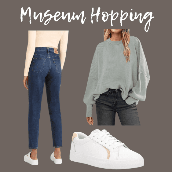 Dark wash jeans, a sweater, and sneakers make for the perfect art appreciation ensemble.