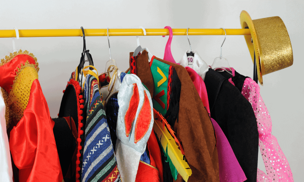 Set up a box of old clothes and Halloween accessories for imaginative play. Kid to Kid, Facebook Marketplace, and garage sales are all great places to find gently used Halloween costumes for cheap!