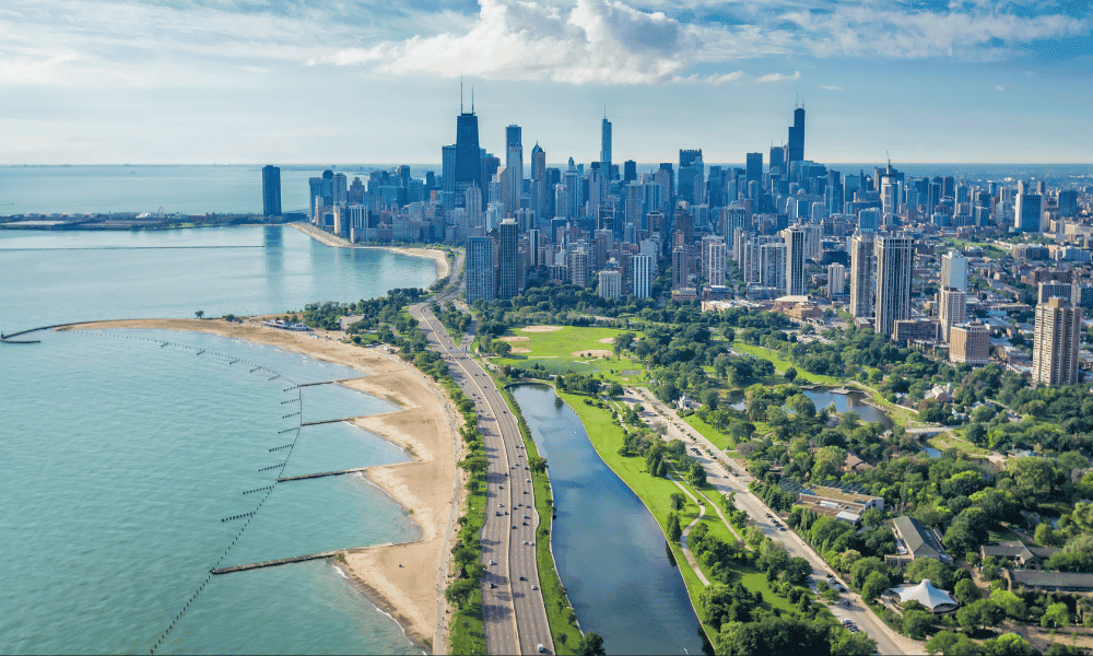 A small beach near the Adler Planetarium on Northerly Island with incredible downtown views.