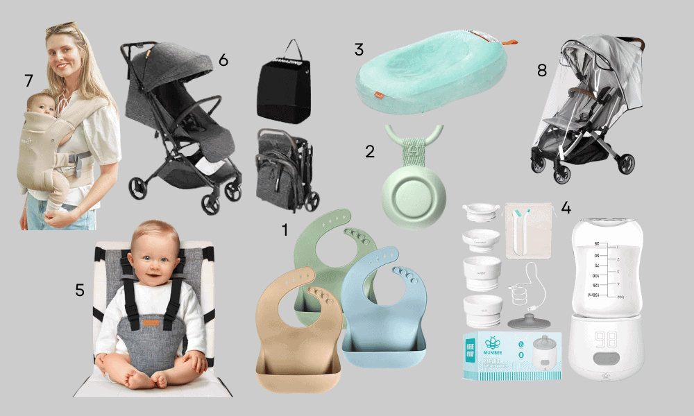 - Silicone bibs with food catchers (because spaghetti stains on vacation outfits are the souvenir NOBODY wants)
