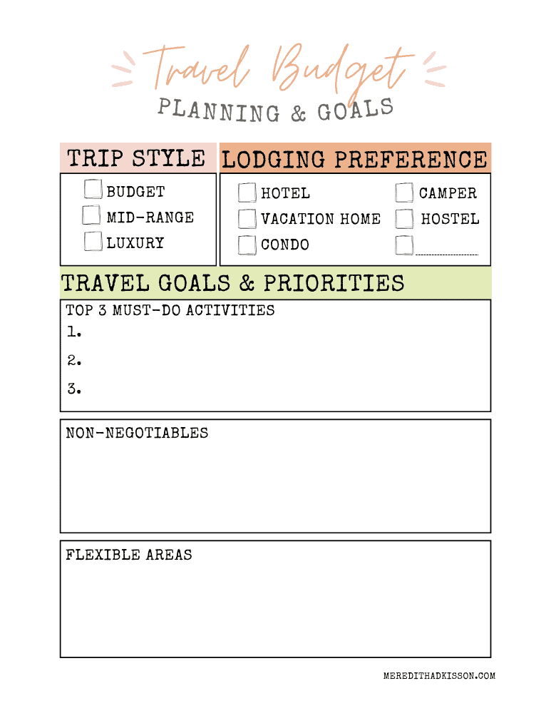 This page is all about your goals for the trip: your budget style, lodging preferences, must-do activities, non-negotiables, and flexible areas. Once you figure out your goals, you’re better able to budget for you trip. If you’re traveling with another adult or with the family, work on this together. Getting them on the same page is super important for a successful trip.