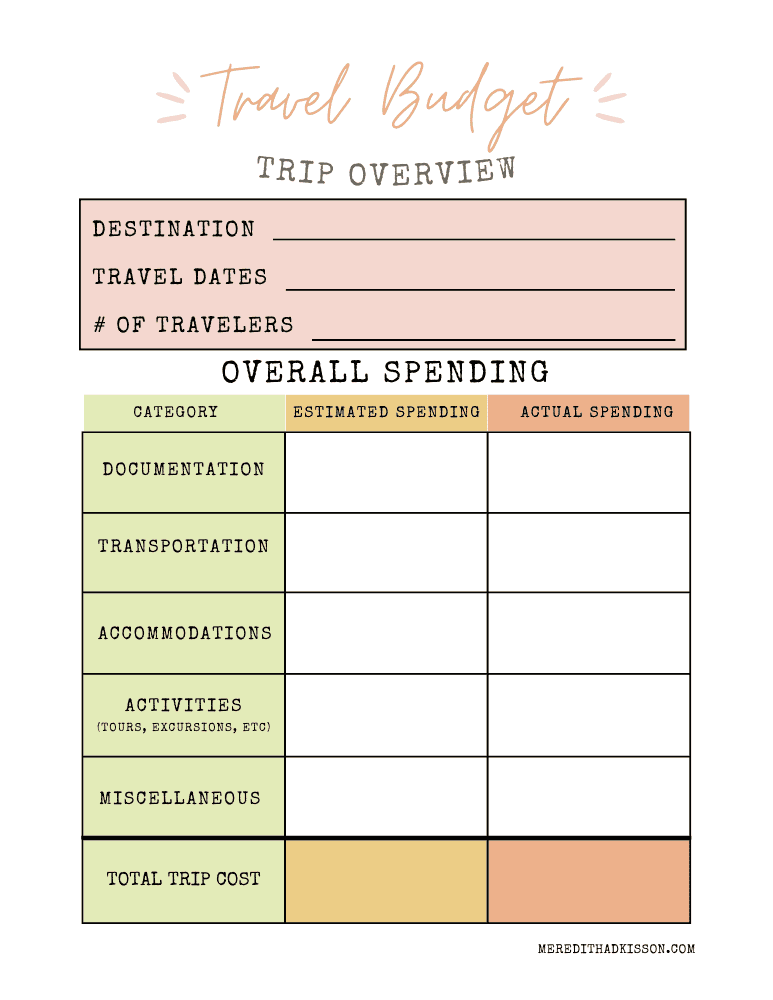 This page is important before and at the end of your trip. Before your trip, you’ll estimate the cost of your entire trip for each category. After the trip, come back and note your actual spending. Hopefully, you’ve stayed within (or under) budget!