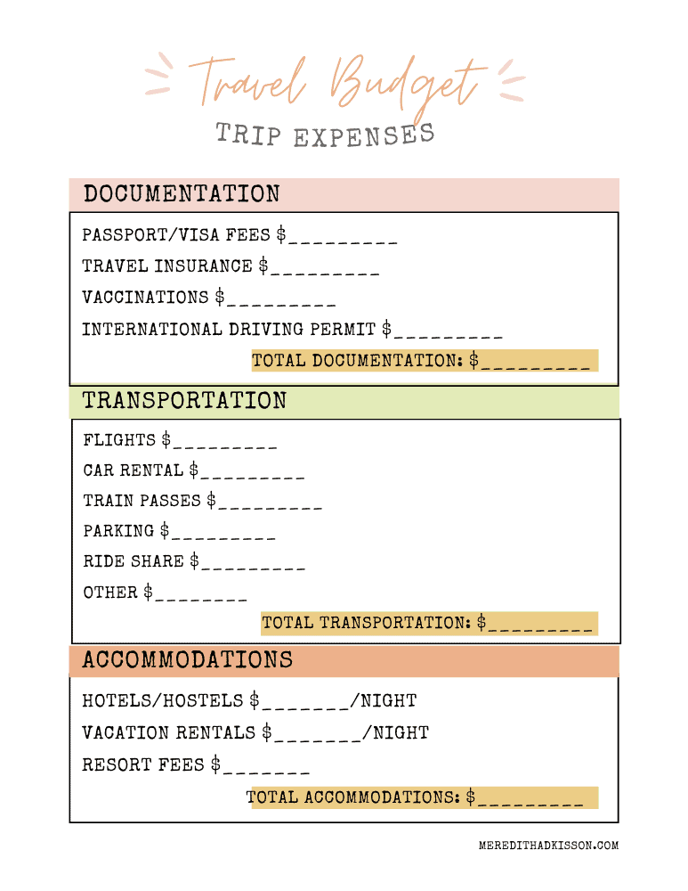 On this page of the travel budget planner, you’ll log your expenses for any travel documentation needed, transportation, and accommodations.