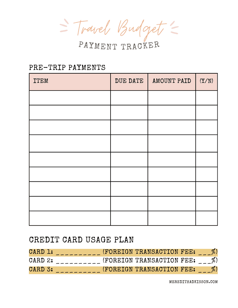 Keep track of all of your pre-trip charges, due dates, and payments on this page. You’ll also be able to note your credit card plan for your travels.