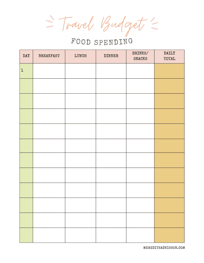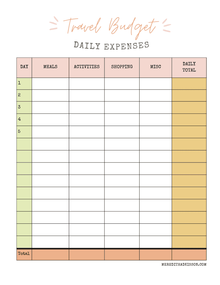 Each day of your travels, log your total expenses for each daily spending cateogy (meals, activities, shopping, miscellaneous). Calculate your total daily spending at the end of each day for easy calculations at the end of your trip. Staying on top of these little purchases is KEY to staying and budget and knowing what you’ve spend so far. Don’t wait until the end of the trip to tally your daily expenses up.