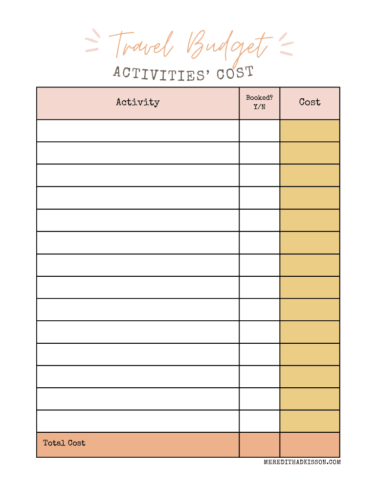 Use this page as you plan your excursions, tours, and other activities during your trip. It will help you keep track of what you’ve already booked, as well as help you keep a running total of the cost of all your planned activities.