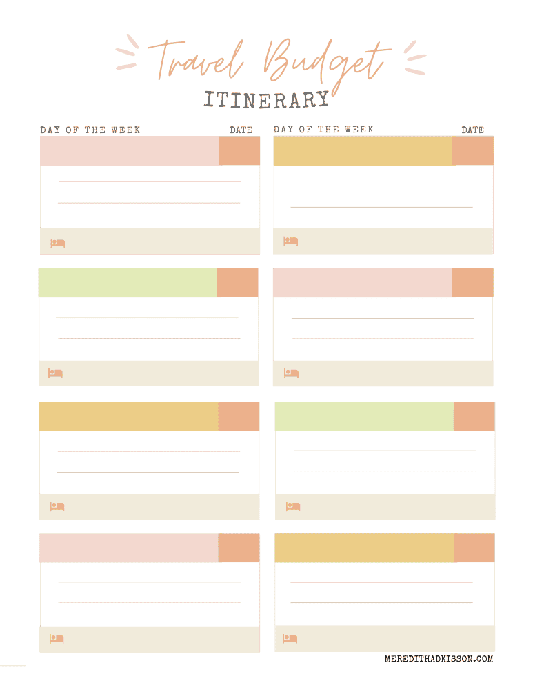 Also included is a travel itinerary, where you can quickly jot down a brief overview of each day and make note of your lodgings at the bottom of each day. If you want to create a more detailed trip plan and itinerary, check out our free travel planner!
